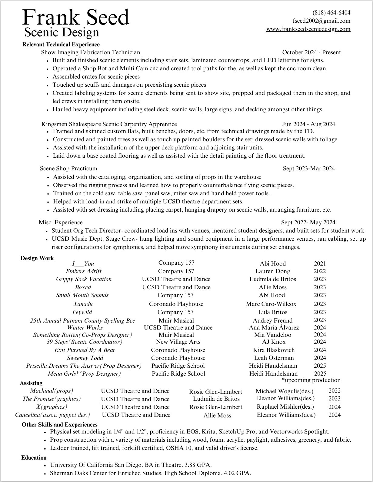 Hey Folks! My name is Frank, I’m a San Diego and LA based scenic designer. I recently graduated from the University Of California San Diego with my BA in Theatre and I’m excited to start my work in the professional world! I love any opportunities to build worlds with other passionate creatives and collaborators! So much of my excitement to design comes from new works since they are so pivotal and necessary in modern theatre to tell stories that shift the narrative and push the envelope of what is possible onstage. If that sort of work excites you too, lets talk!